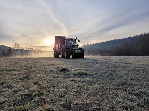 Für das Mistführen benötigen wir nämlich einen möglichst gefrorenen Boden. Wäre der Boden nicht gefroren, würden unsere schweren Maschinen diesen bei der Überfahrt zu sehr verdichten. Das ist schlecht für das Bodenleben, die Kapillaren (die für die Durchlüftung und Wasserleitfähigkeit zuständig sind) und auch für die Erde selbst. Aber was macht denn der Mist auf unseren Feldern? Der Mist aus unserer Bio-Landwirtschaft ist eben kein Abfallprodukt, sondern ein hochwertiger, biologischer N-P-K Dünger, der dem Humusaufbau auf unseren Wiesen und Feldern dient.